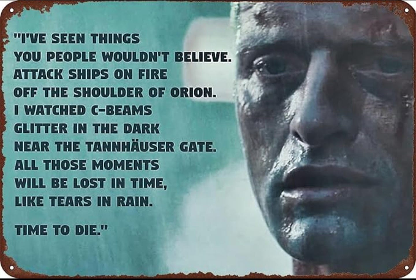 Come on, everyone's seen Blade Runner! That scene in the rain when Rutger Hauer breaks your heart as he says, "All those moments will be lost in time, like tears in rain." And you would swear on anything that he’s actually weeping.